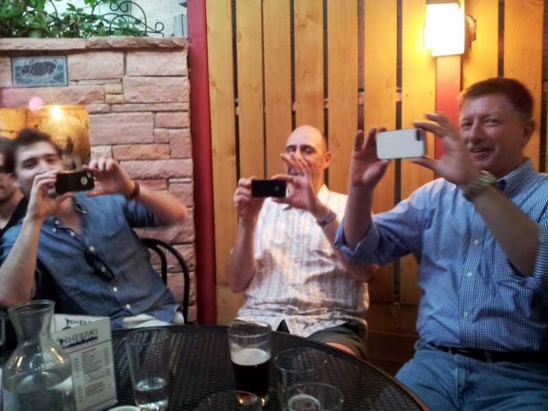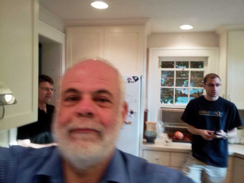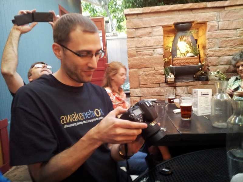 BLINDED BY THE LIGHT! In complete disregard for the Buddhist precept to Do No Harm, I brazenly blind people with the flash of my cell camera as we all sat amidst the greenery of the backyard drinking beer after a long day of Buddhist Geekery.