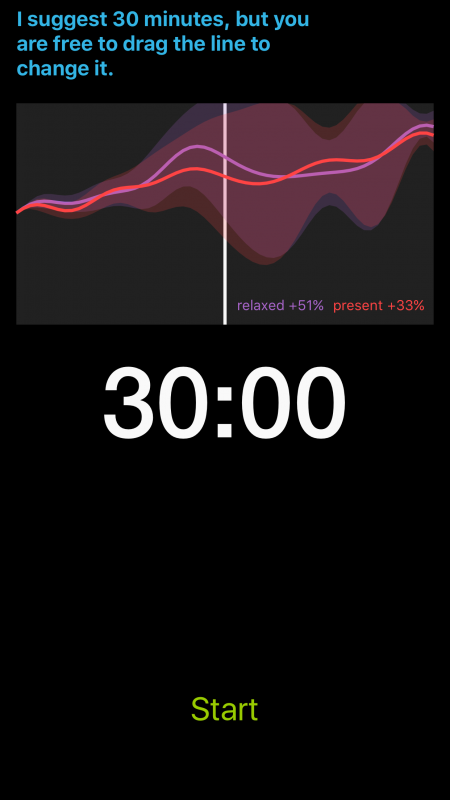 Immediately before and after the meditation session you log your mood. Based on these reports, the machine learning engine starts drawing correlations to predict future moods based on length of meditation session. These predictions are displayed along with the level of uncertainty about those predictions, so you can decide how long you'd like to meditate.